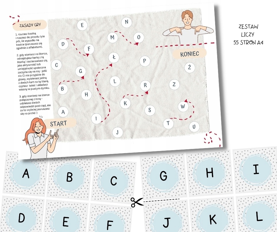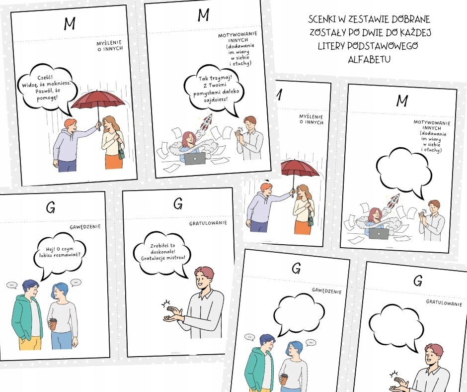 TUS ALFABET UMIEJĘTNOŚCI SPOŁECZNYCH Z GRAMI - zestaw (55 stron A4), który poprzez gry z alfabetem rozwija myślenie o normach społecznych i innych ludziach. Gotowe frazy pomagają w nauce rozmawiania.